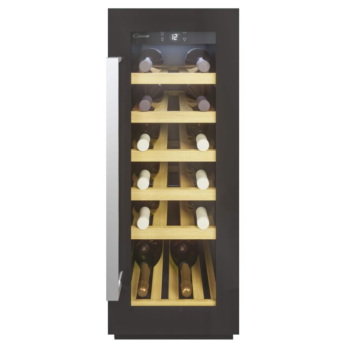 : CandyVstavaná vinotéka šírka 30 cm - Jednozónová, elektronické ovládanie, displej, LED osvetlenie, 6 drevených políc, tichý chod - antivibračný systém