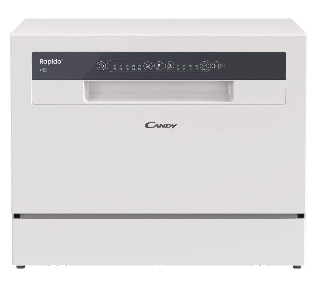 Voľne stojaca stolová umývačka riadu Candy CP 6E51LW Rapidó v bielej farbe s kapacitou pre 6 súprav riadu. Ponúka 5 umývacích programov. Disponuje rýchlym programom, ochranou proti pretečeniu, funkciou odložený štart, polovičná náplň. Vnútornú výbavu tvorí 1 kôš na nádoby a košík na príbory.
